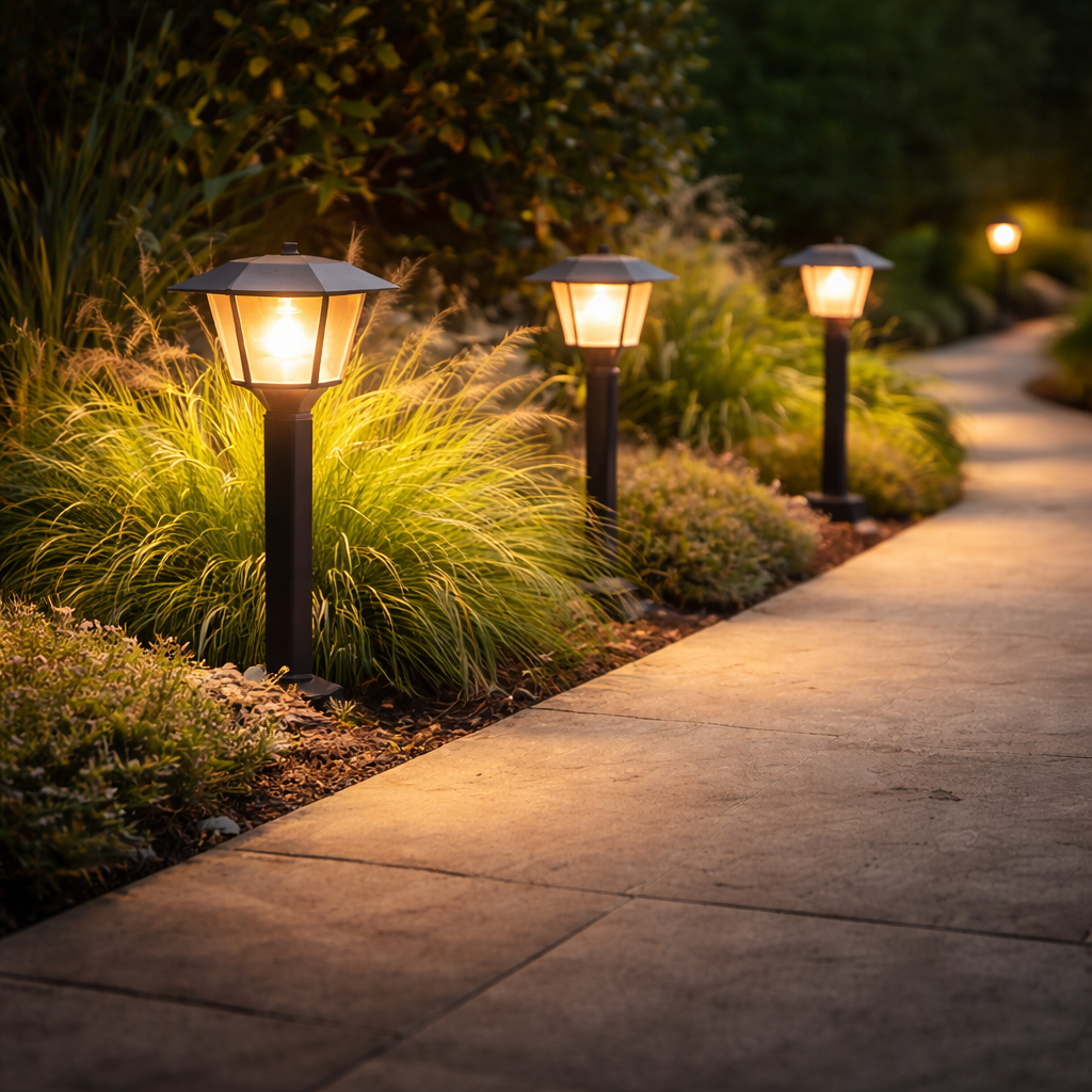Iluminação externa que cria charme e segurança no caminho, varanda e área gourmet — com efeito visual incrível e clima acolhedor.