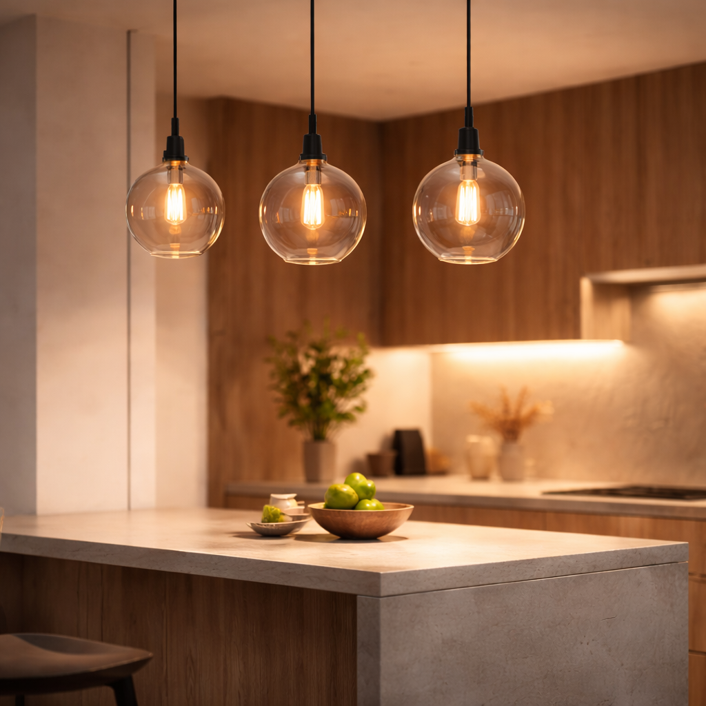 Pendentes e luminárias com design clean e luz aconchegante — perfeitas pra cozinha, bancada e sala. Um detalhe que transforma tudo.