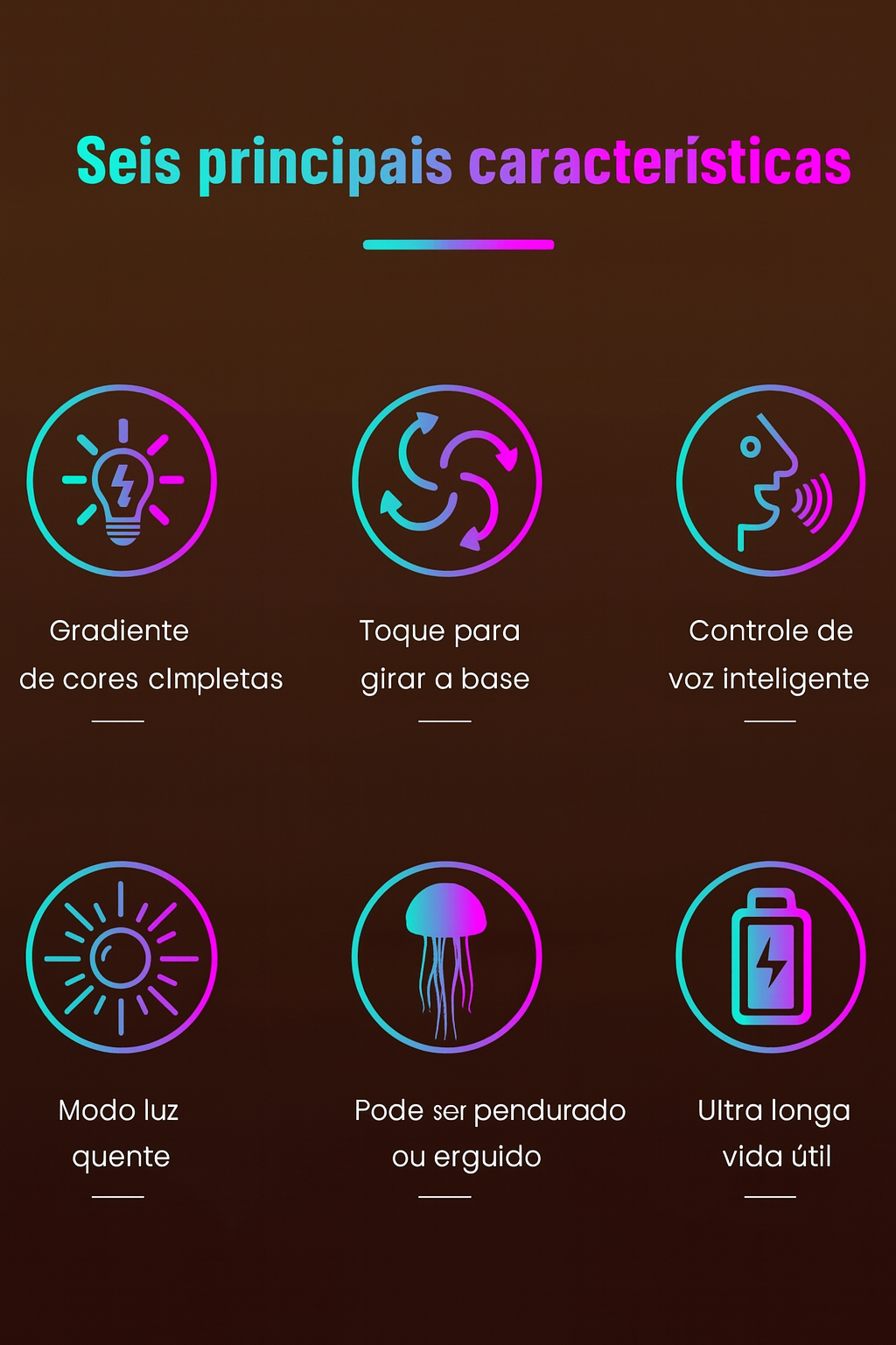 Transforme o ambiente da sua casa com um toque de mágica e elegância. A Luminária LED Água-Viva cria uma atmosfera encantadora e relaxante, simulando o suave movimento das águas-vivas com luzes coloridas e movimento dinâmico. Perfeita para decoração, relaxamento, leitura noturna ou presentes criativos.