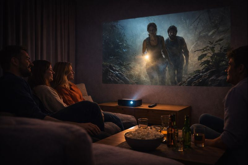 Amigos reunidos assistindo em grande tela com o mini projetor.